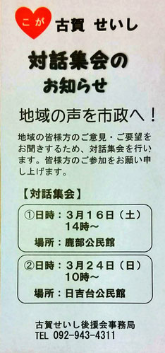 3月24日(日)10:00から、古賀市日吉台公民館で「日吉台の皆さんの声を聴く会」を開催します。