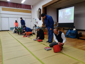 鹿部公民館で鹿部区・日吉台区合同防災訓練(研修)が実施され、私も参加させて頂き、粕屋北部消防本部の職員の指導の下、AEDの実地体験も行いました。