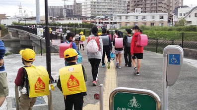 新一年生が黄色いランドセルを背に、はじめてのあいぼう橋の渡り始め。上級生に守られながら元気に登校していきました。多くの友と仲良く学び、あそび、一日もはやく学校生活に馴染み、夢に向かって羽ばたいてほしいと思っています。
