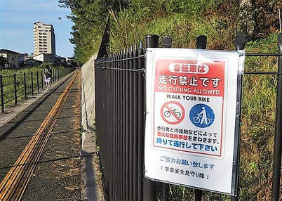 とのご指摘を頂き、早速「学童見守り隊」事務局に「自転車走行禁止」の注意喚起POPを作成頂き、古賀市の承諾を取った上で遊歩道の数ヶ所へ掲出しました。