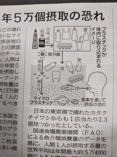 今朝の 西日本新聞では、プラスチックゴミなどが壊れてできる「5mm以下の微小なマイクロプラスチックが、世界各地の魚介類に含まれていた」との衝撃的な調査結果を、英ハル大などのチームが発表した。との記事を掲載した。