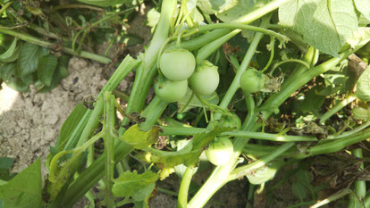 今日は議会の合間に久しぶりに畑に行き、かぼちゃのつるを整理していたら隣の畝のジャガイモの茎に青いちいさな実、まさか土のなかでなく茎に実がなっているのは、初めて見る不思議な果実?でした。