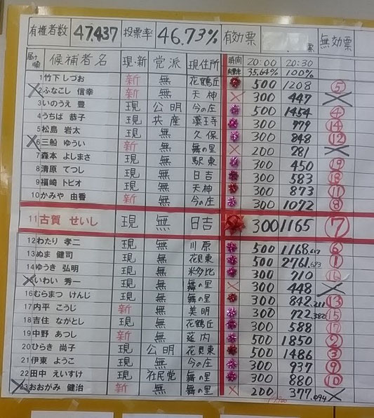 午前8時30分から受付開始された古賀市議会議員選挙で、届け出順は厳正な抽選の結果「11番」となりました。また、午前9時の段階での立候補者数は、定員19議席に対して計23名となっています。