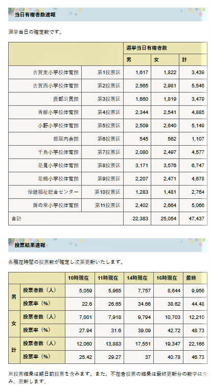 ↑ 上記画像をクリックすると古賀市選挙管理委員会の選挙速報HPにアクセスします。